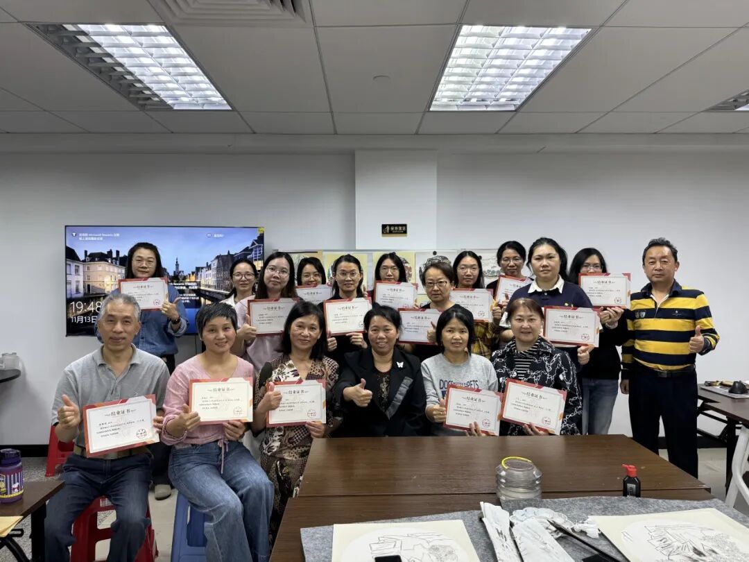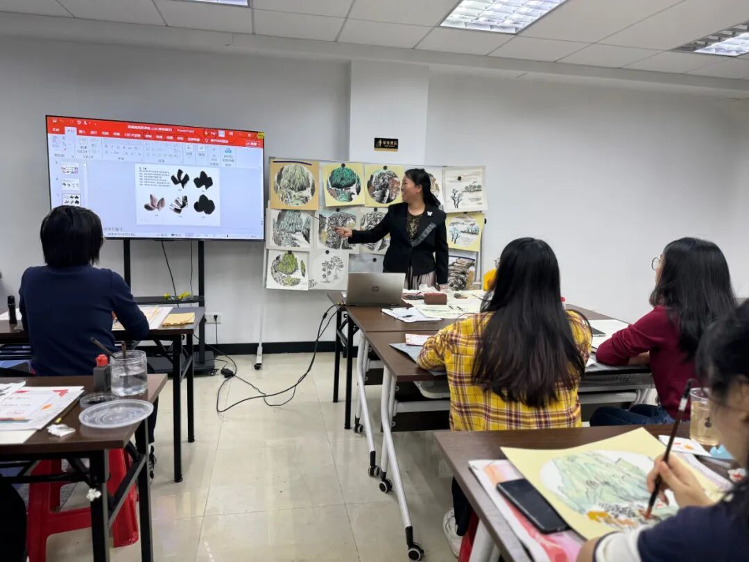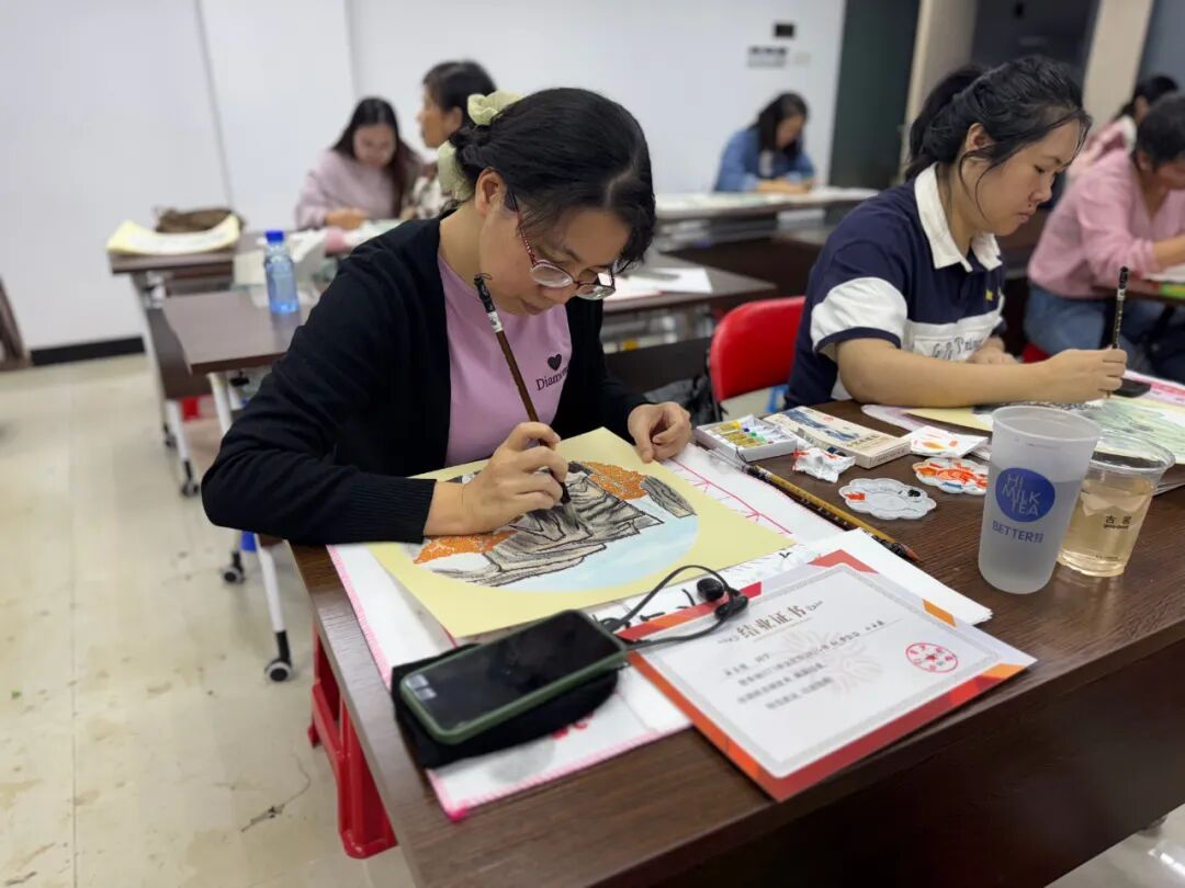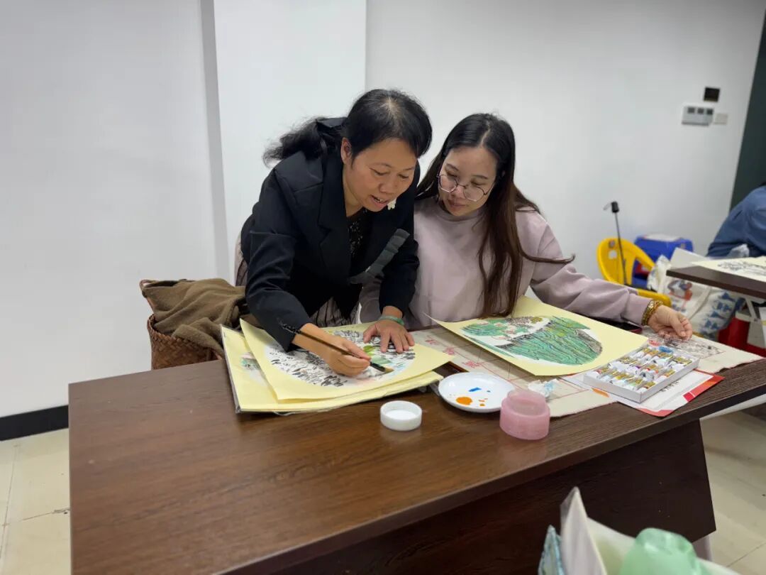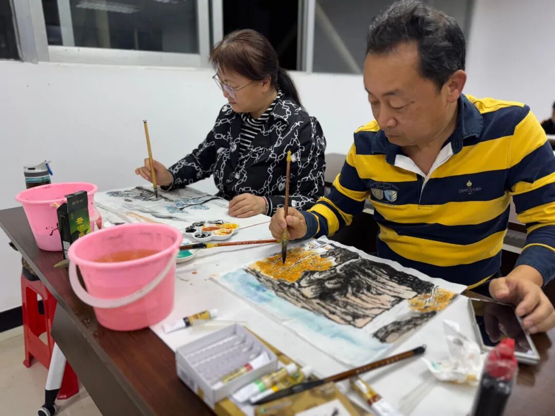 本期山水画培训班于10月21日开课,于11月13日结课。山水画班的课堂展现出一派文人雅集的气象:每周二、四晚,位于文化馆五楼的教室里墨香四溢,学员们或凝神勾勒,或挥毫泼墨,在老师的悉心指导下逐步掌握中国画的笔墨技法。通过八次课程的系统学习,学员们从最初的生涩笔触到后来的挥洒自如,不仅完成了《曲水流觞》《山色朝晴》等多幅作品,更在创作过程中深化了对传统山水画意境的理解与表现。